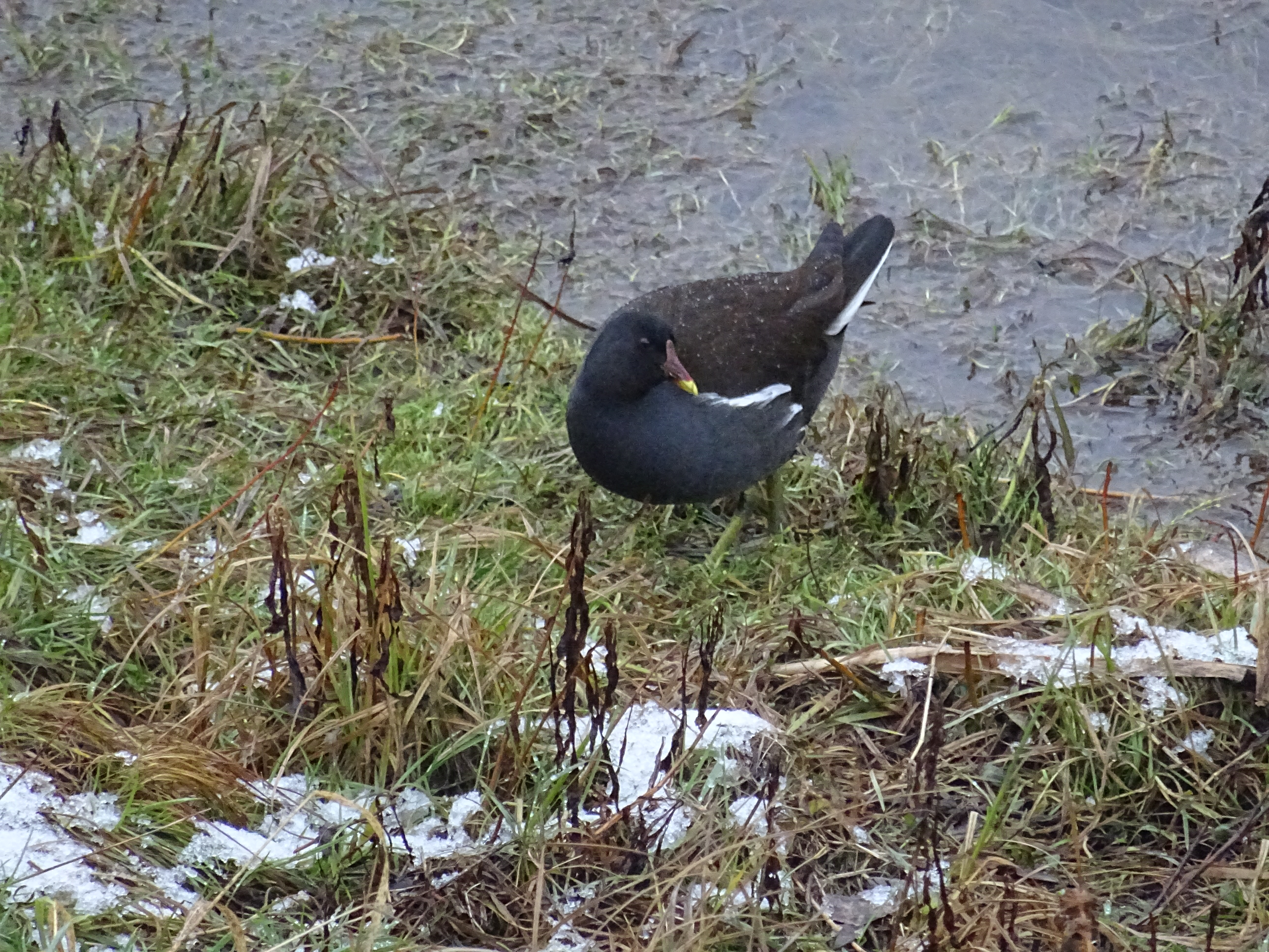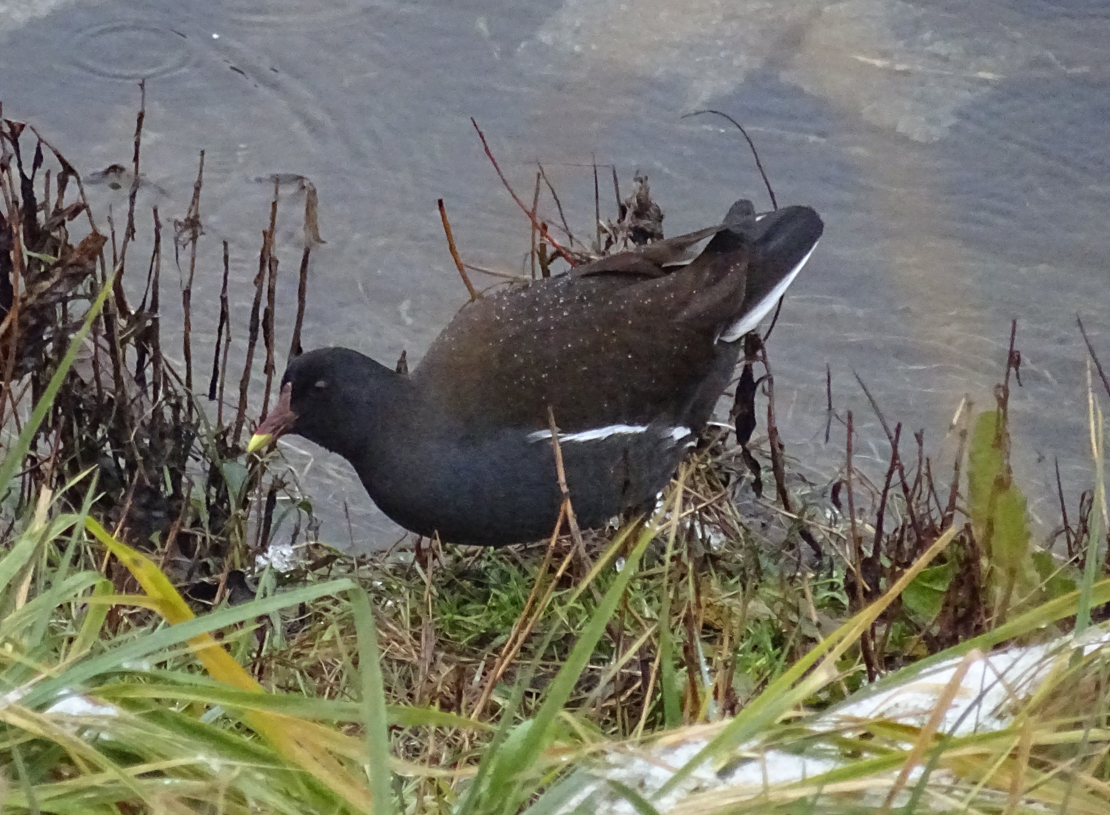 Tohoto ptáka jsem v zimě v roce 2020 viděl v Břeclavi na břehu Dyje, asi poprvé v životě. Zpočátku jsem si myslel, že to je lyska, ale pak jsem si všiml žlutočerveného zobáku, bílých pírek naspod křídel a na ocasu a také, jak si vykračoval po břehu a vůbec se nechystal do vody. Až podle encyklopedie jsem zjistil, že se jedná o slípku zelenonohou. Ano, má opravdu zelené nohy a při chůzi se tak tetelila a házela ocasem jako slepice. Myslím, že název je příznačný.